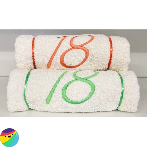 Brisača je bež barve z zelenim ali oranžnim vezenjem (barvo izberete ob nakupu).