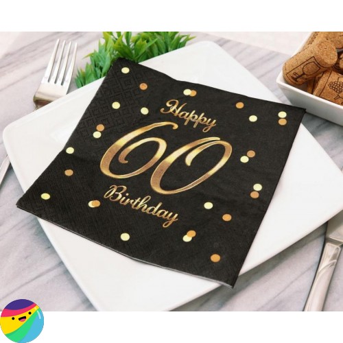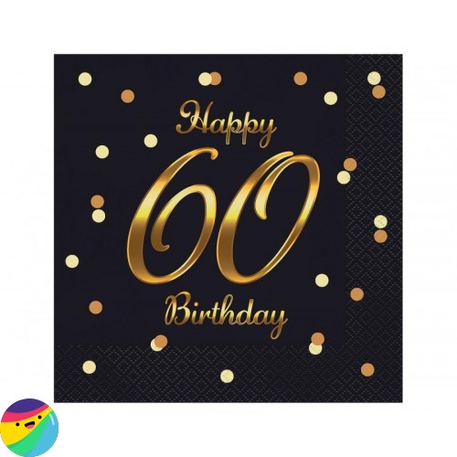 V paketu prejmete 20 papirnatih servietov z motivom Happy BIrthday 60 v črni barvi.